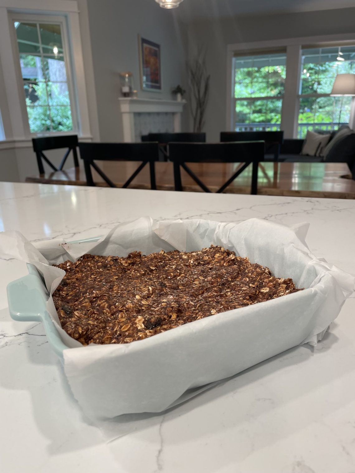 Step Nine: Using the parchment overhangs, transfer the granola bars to a cutting board and cut into ~14 bars. Enjoy!