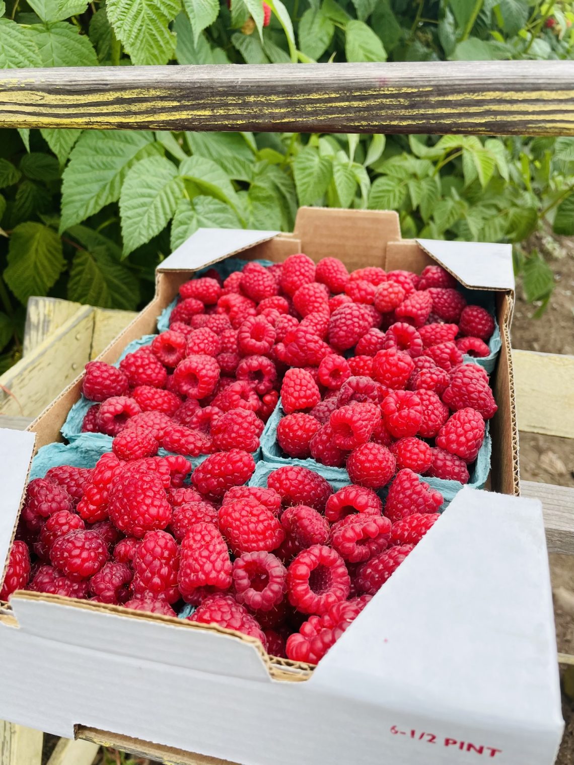 Picking Raspberries: I arrived right as the farm was opening at 9am on a Saturday morning. I parked my e-bike in the field nearby and was directed to a specific row of raspberries, given a raspberry caddy (wooden rack for holding the box), and a cardboard box with 6 pints inside. The key is to pick the raspberries that separate easily from the core which remains on the plant. I like to have a mixture of very ripe (fall of effortlessly) to a little under ripe (need a little tug) to have a balance of sweetness and tartness for my raspberry jam.