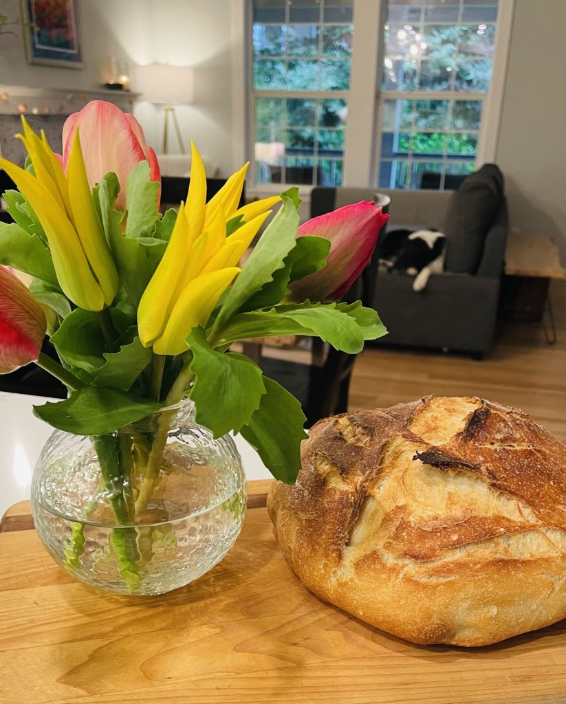 This photo is of my third loaf of sourdough next to tulips from my garden – I plant them every Fall in honor of my beloved Mom, Kelly. You can also see my sweet rescue Border Collie, Isla resting in the background. This photo captures the things I cherish most – home, peace, flowers, and making delicious food for my husband & daughter to enjoy around the table.