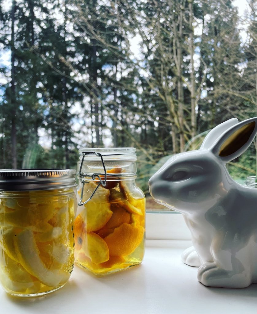 Step One: Put the citrus peels in a 12 oz. mason jar and then fill the jar with distilled white vinegar. Let it sit for a minimum of 2 weeks – this can be on your countertop, on a shelf, or in your pantry. I like to make a note of the date that it will be ready on the top with a small sticky note.