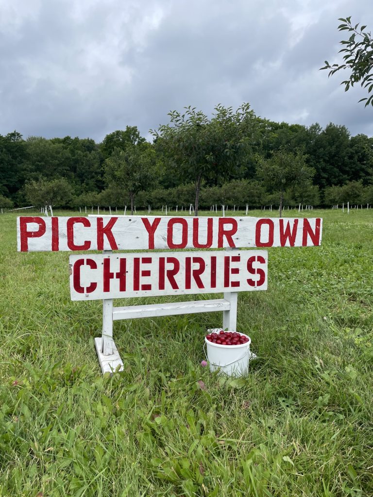 Picking Cherries: I paid a flat rate of $15 for a large pail and we headed out into the orchard. We were given instructions on what trees to pick from and my Dad & older brother contributed cherries to my pail. We were told to look for cherries that are red (not orange) and if the pits pull out when we picked them then they are not ripe yet. We had it filled up and overflowing within 15 minutes! The variety we were picking was Tart Montmorency.