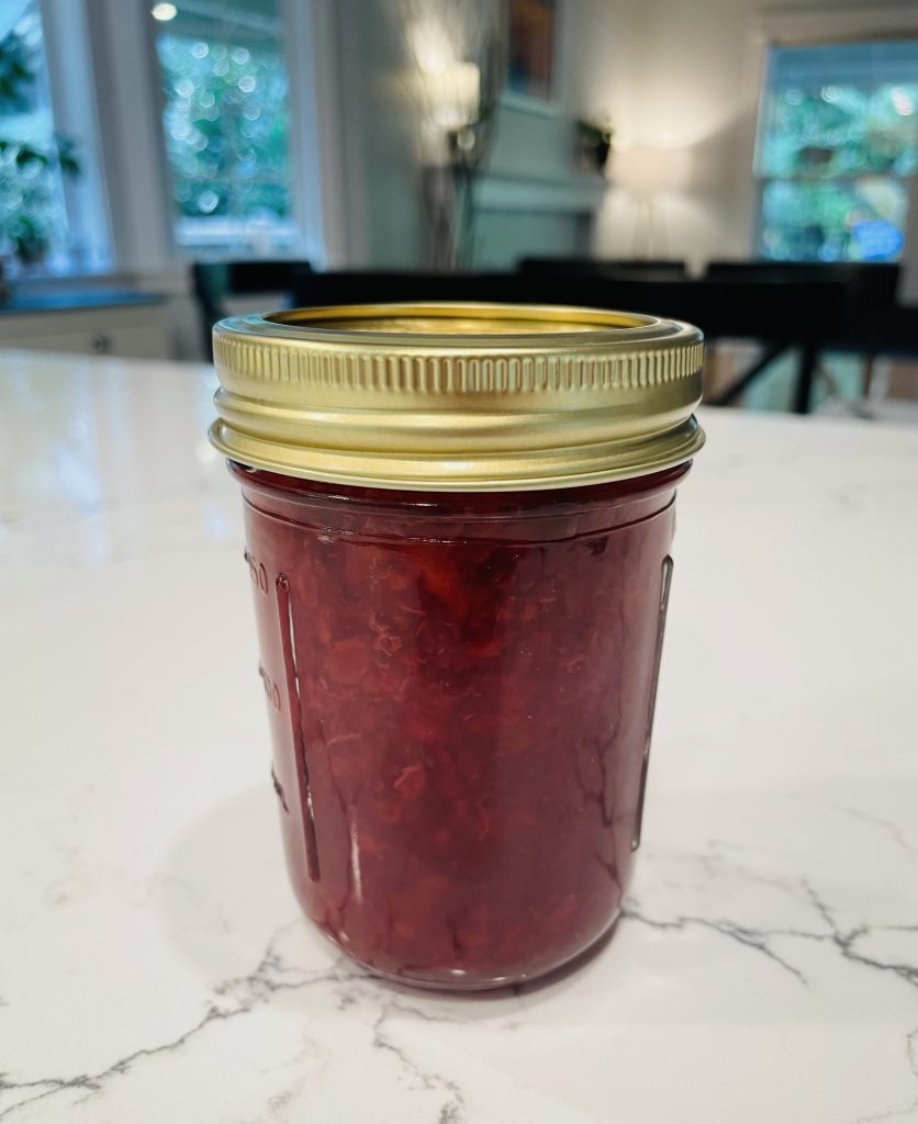 Step Seven: After the jars have cooled completely you can check the seals by pressing the middle of the lid with your finger – if the lid springs back the lids are not sealed and you’ll need to refrigerate the jars. If the lid does not spring back then it is safe to store in your pantry for ~ 1 year. Enjoy!