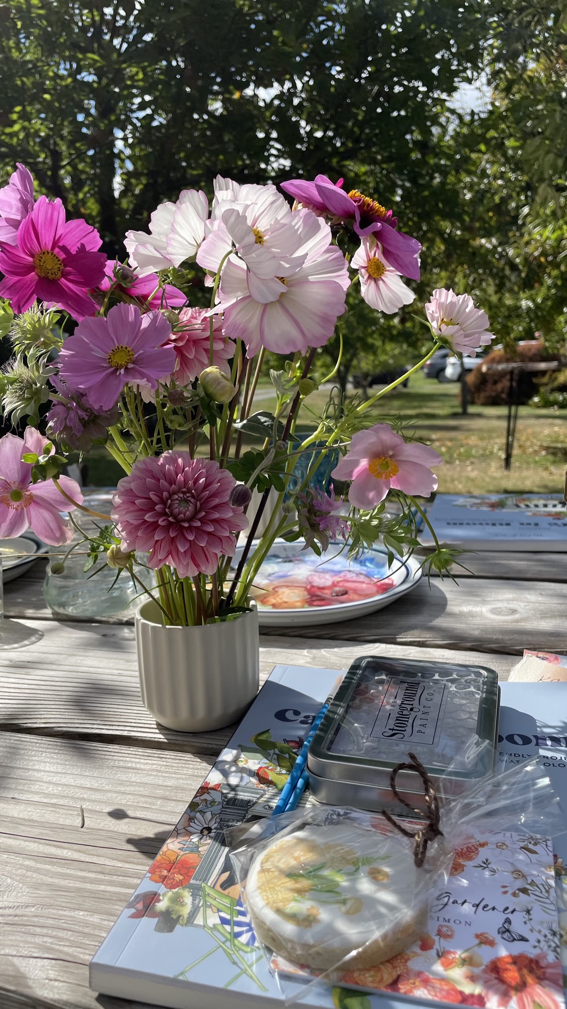 Each attendee was given a watercolor workbook that includes 25 beginner-friendly projects on premium watercolor paper (written and designed by Sarah Simon, The Mint Gardener), Stoneground Paint Co. watercolor palette that has 24 different colors, and two brushes (Round 1 and Round 4). We also had beautiful homemade sugar cookies at our place setting and the Ikebana style floral arrangements we made in the floral design portion.