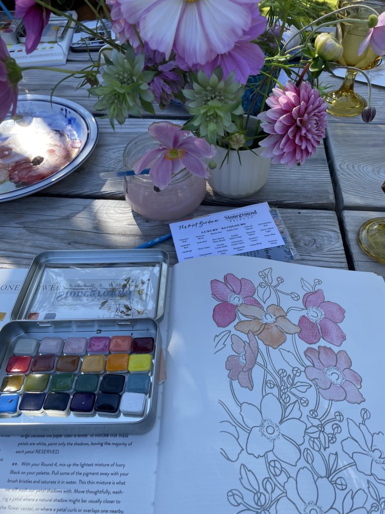 This was a four hour workshop hosted by Ciderpress Lane and taught by Sarah Simon, The Mint Gardener. The workshop consisted of three parts; 1. Floral Design, 2. Learning how to watercolor, and 3. Connecting with other workshop attendees while enjoying appetizers, drinks, dessert & coffee. It was a gorgeous fall afternoon to enjoy the workshop in the Ciderpress Lane orchard. This post will focus on the second element of learning how to watercolor.