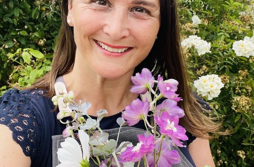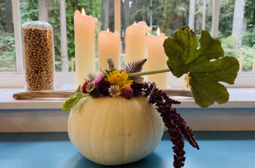 Last year I took an everlasting wreath class at a local flower farm. It was my first time working with dried flowers and I was surprised by the colors and variety to choose from. Shortly after taking the class I went to a flower farm and cut many varieties of flowers to dry at home – strawflowers, gomphrena, celosia, amaranth, paper daisies, poppy pods, craspedia, dusty miller, etc. I also pick up small pine cones and pine branches while I am out walking my dogs. I made mini everlasting wreaths for each place setting for our family Thanksgiving meal and some extras to add to small gift bags for hostess gifts. They are a very cute and easy gift.