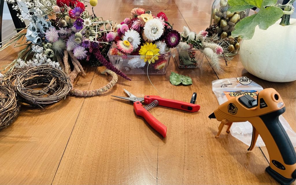 Important Note: If the back of the flower is somewhat flat (like strawflowers, gomphrena, paper daisies, poppy seed pods) then cut the stems completely off and add glue to the back of the flower. If there is a stem that is useful for weaving into the wreath (like amaranth, celosia, dusty miller, baby’s breath) just cut the stems short and glue those to the wreath or weave it into the grapevine. Nest flat laying flowers over the stems so they are hidden.