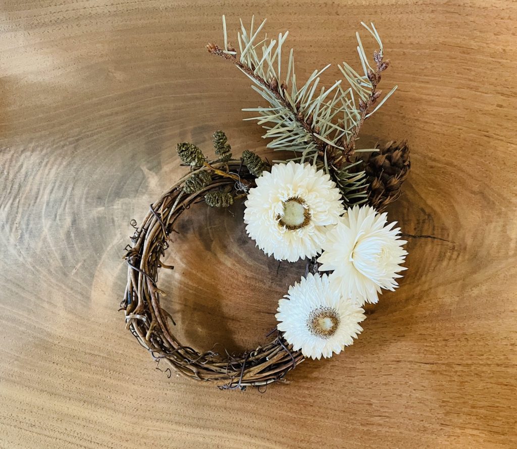 I like to keep my wreaths pretty simple and use 5-9 flowers in total. Don’t overthink your designs, just use dried flowers that you enjoy. You can also add a short piece of ribbon or twine if you want to hang your everlasting mini wreath on a gift bag, in a window, on a holiday tree, etc.