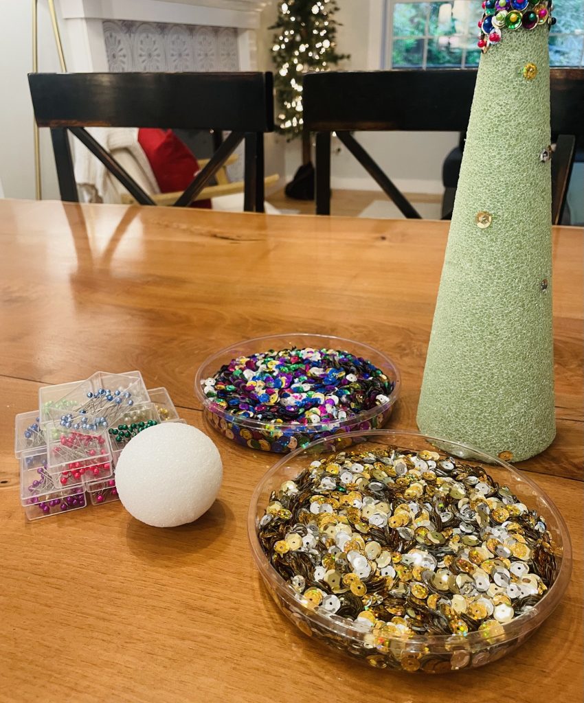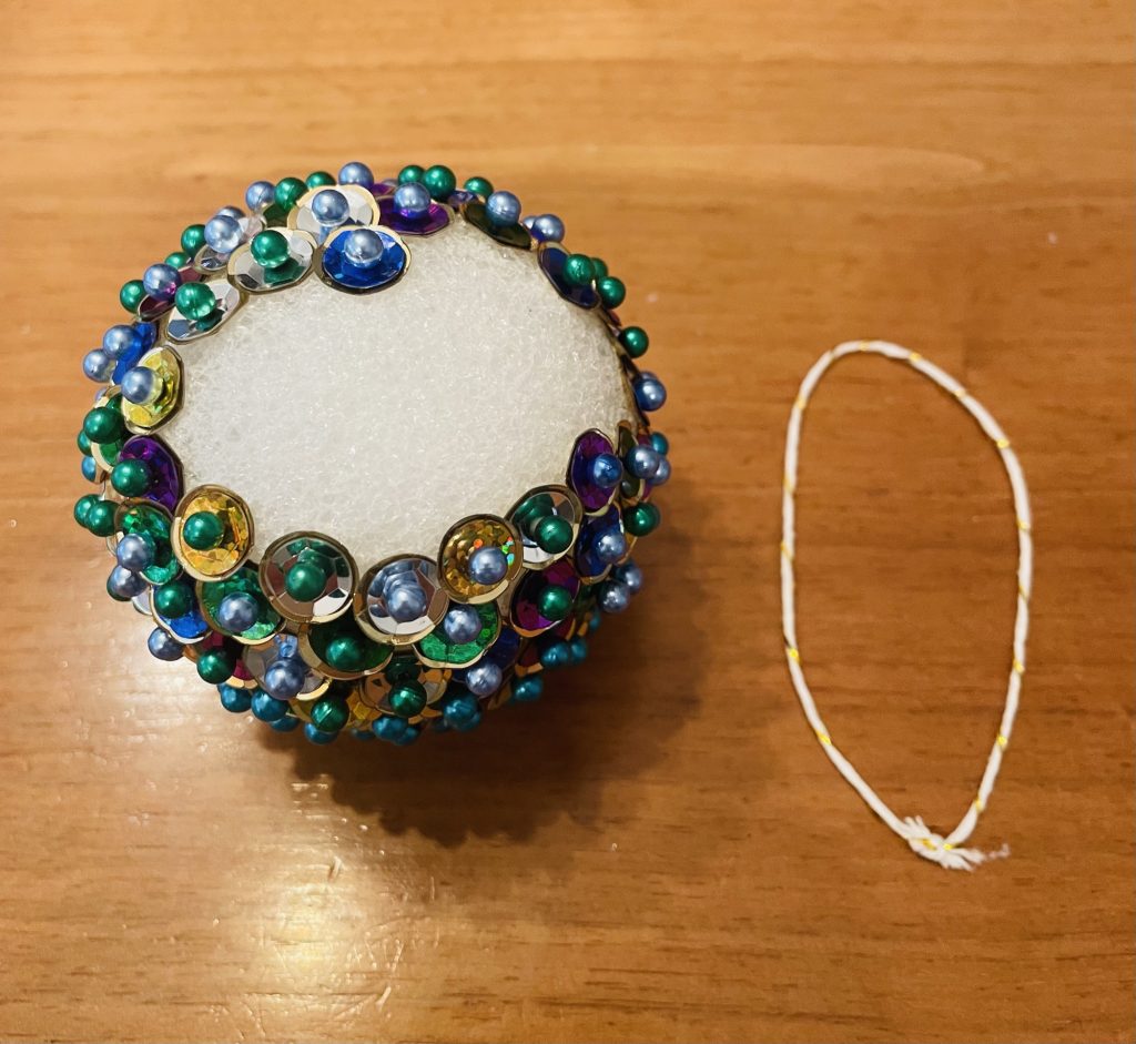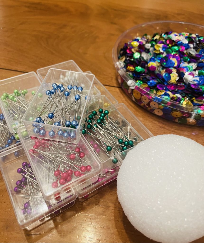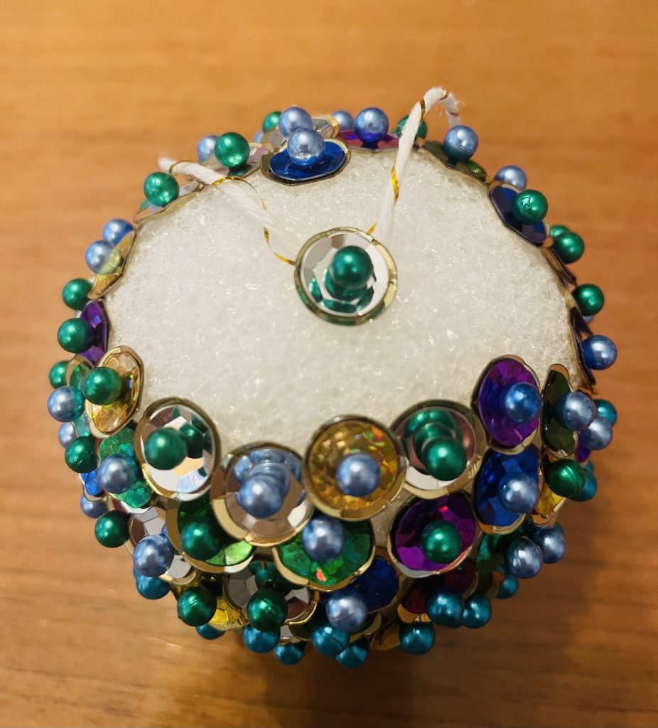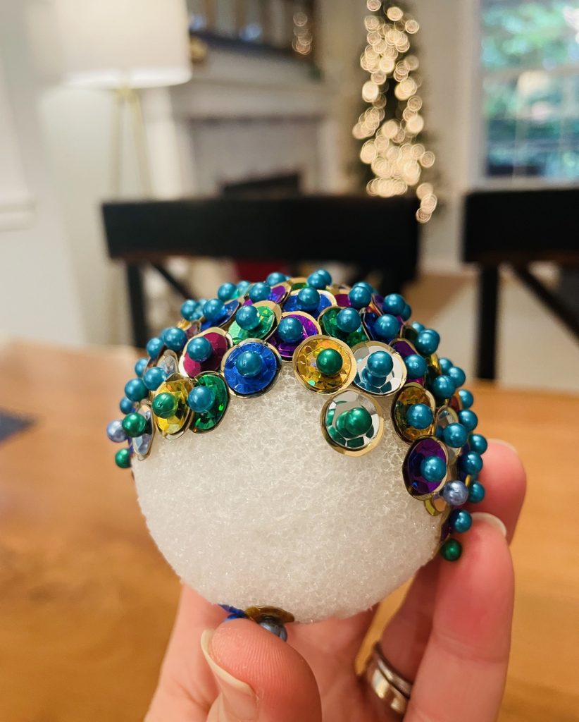 Step Two: Take a pin (with the color of head you want to use) and pick up one small sequin (1mm or 4 mm) first followed by a large sequin (10mm) so there are two sequins on your pin. The sequins have a hole in the middle of each one so you are simply putting your pin through the hole in the middle. I like to use a colorful small sequin and a gold or silver large sequin but feel free to do whatever you like best! Place the pin into the styrofoam ball. Slightly overlap the pins as you place them in so you do not see the styrofoam at all (see below photo). Repeat this same process until your ornament is 80% complete.