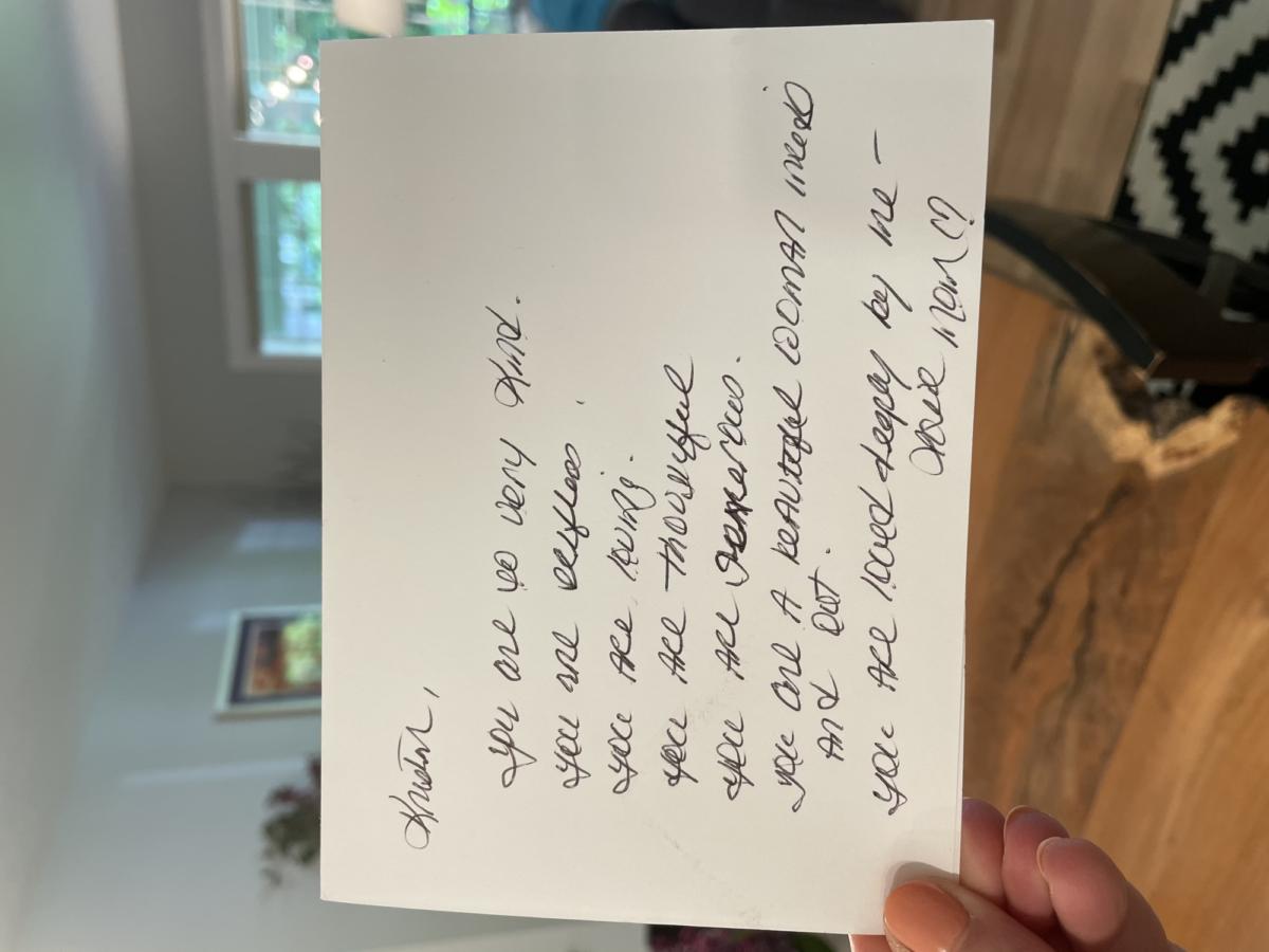 I am opening my heart to share with you one of my most prized possessions, this handwritten note from my Mom. I read this note every morning – it’s a reminder of who I am – a beloved daughter who is cherished and deeply loved. This note gives me the strength to move forward, the kindness to speak gently, the love to keep on giving, compassion for others, the generosity to know that my source is unlimited, and the beauty to shine the light I have within myself. I am a grateful heart.
